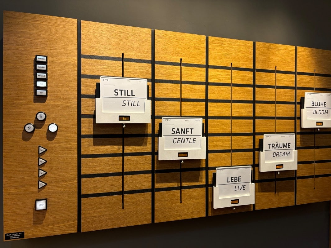 Eine weitere Möglichkeit die Musik be-greifbarer zu machen ist die Komponierstube. Hier kann man mit Geräuschen und Tönen experimentieren. Besonders intensiv habe ich mich mit dem Liedgerät beschäftigt. Hier konnte ich einzelne Worte bestimmten Tönen zuordnen. Am Ende entstand ein kleines „Lied“ mit mal mehr oder weniger Sinn und auch mal mehr oder weniger schönem Klang. Aber lustig war es!