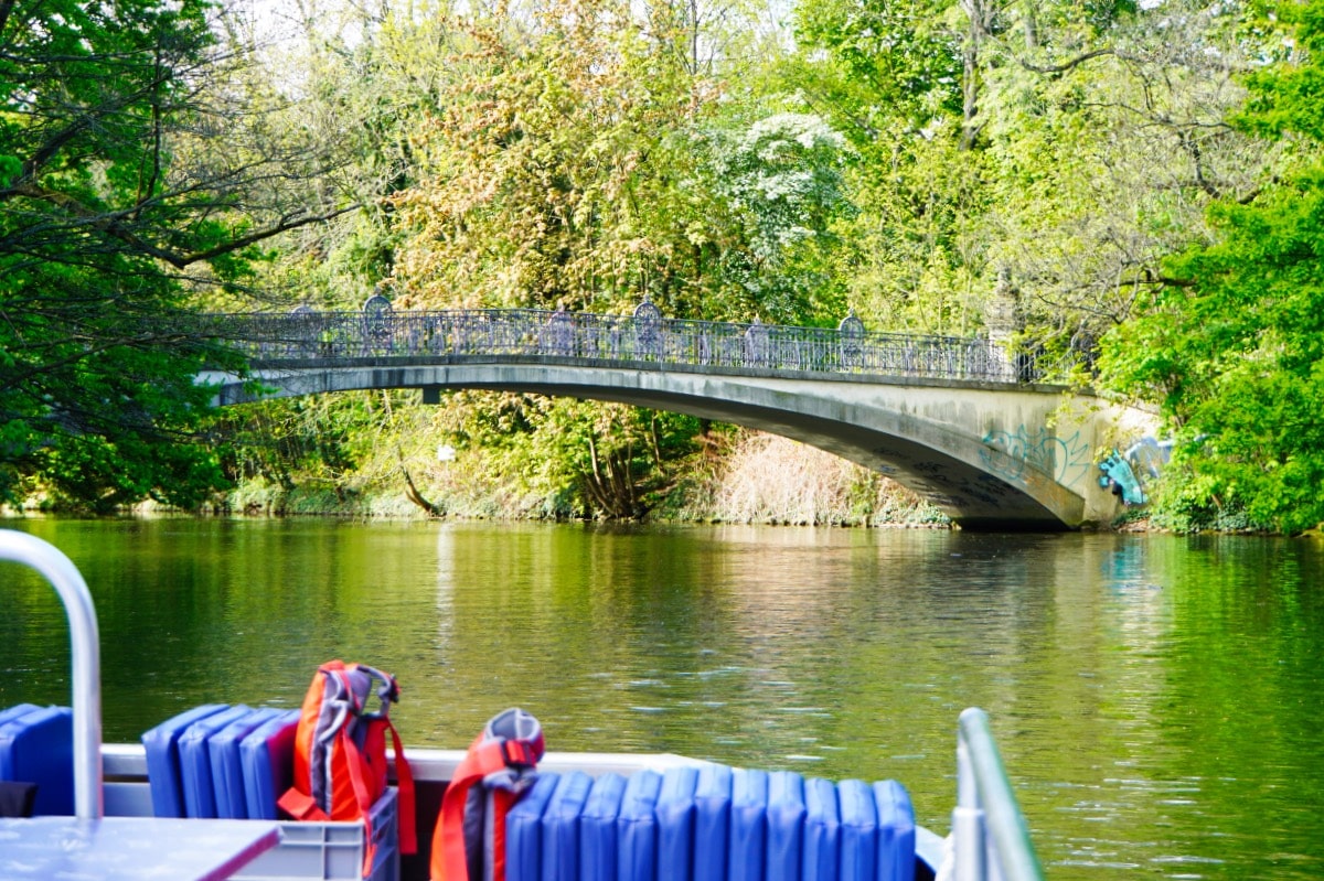 Das Motorboot passiert das Palmenwehr und fährt weiter in die Weiße Elster.