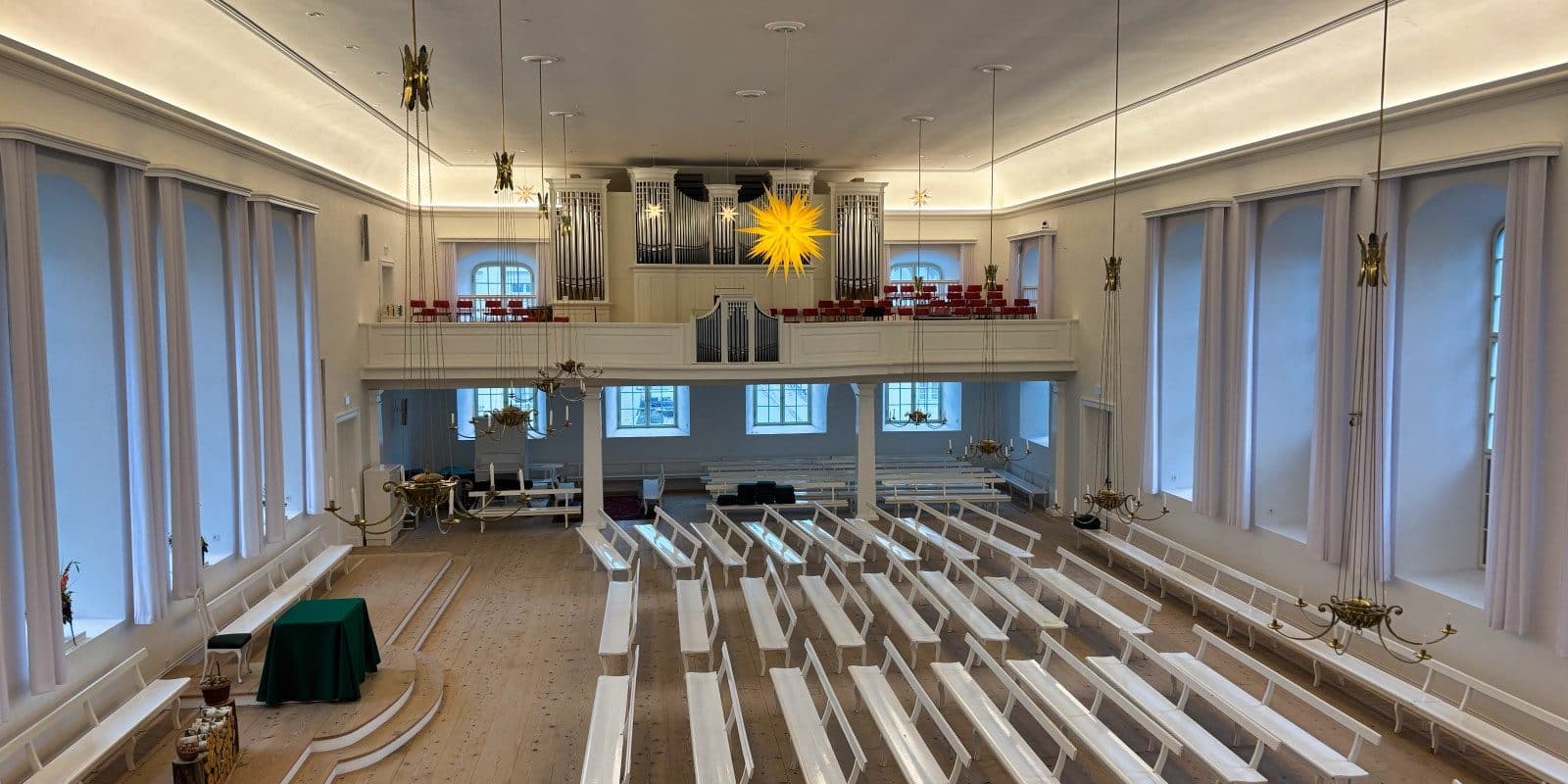 Der Große Kirchensaal am Zinzendorfplatz ist das geistliche Herz der Herrnhuter Brüdergemeine. Das Gebäude wird von der Gemeinde bewusst nicht „Kirche“, sondern „Saal“ genannt, um seinen Charakter als schlichter Versammlungsort der Gemeinschaft zu betonen.