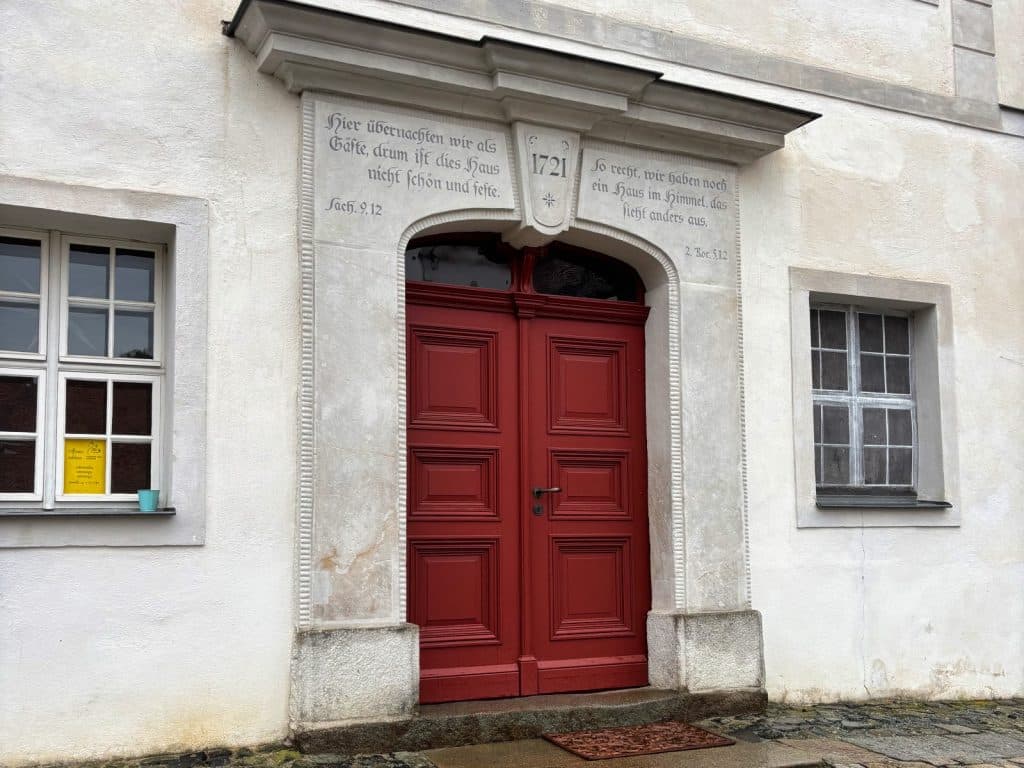 Das Schloss war mehr als nur der Wohnsitz des Grafen. Es wurde zum geistlichen und administrativen Zentrum, zum „Jüngerhaus“. Von 1791 bis 1913 hatte hier die Unitäts-Aeltesten-Conferenz (die Kirchenleitung der weltweiten Brüder-Unität) ihren Sitz. Genau hier wurden über ein Jahrhundert lang die Herrnhuter Losungen gezogen. Bei der Sanierung wurde eine Tür freigelegt, die mit alten Bibel- und Liedversen bemalt ist. Vielleicht die eigentliche Inspiration für diese wunderbare Tradition, die bis heute Millionen Menschen täglich verbindet.