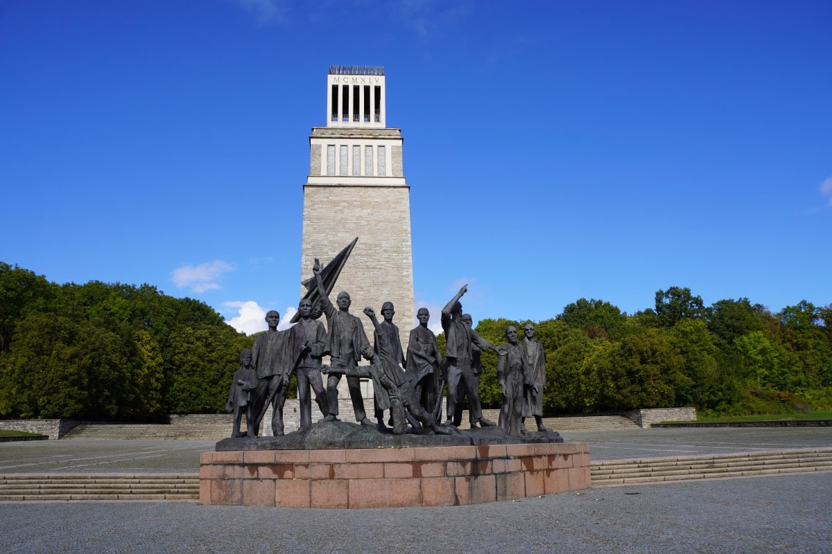 Direkt vor dem Glockenturm, am Ende des großen Platzes steht eine große beeindruckende Figurengruppe. Fritz Cremer hat diese Bronzeplastik, die die „Selbstbefreiung“ der Häftlinge des KZs unter der Führung der Kommunisten zeigt, geschaffen.