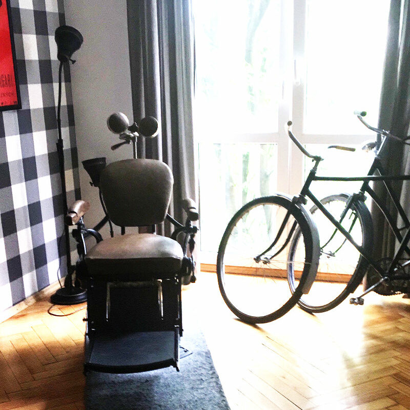 Einen Blickfang im Wohnzimmer ist aber der alte Stuhl, der im Raum steht. Ich bin mir nicht ganz sicher, es könnte ein Barbierstuhl oder ein alter Zahnarztstuhl sein. Auf jeden Fall sitzt er sich richtig bequem.