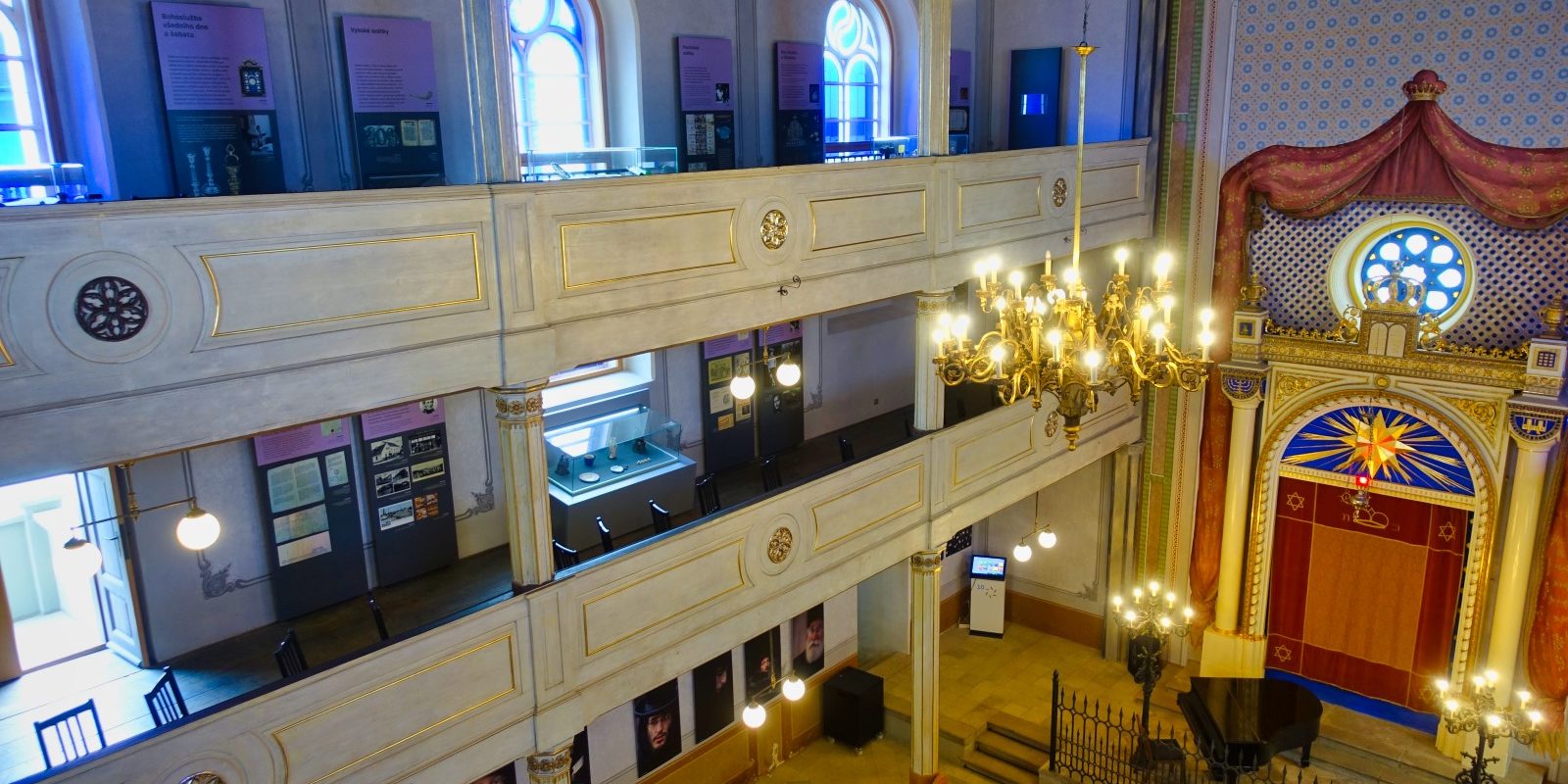 Nachdem wir uns zunächst in der Haupthalle etwas umgeguckt hatten, sind wir über eine enge ausgetretene Wendeltreppe in die Galerien gestiegen. In beiden Stockwerken befindet sich eine Ausstellung. Im ersten Stock erfährt man etwas zu der Geschichte der Juden in der Region rund um Pilsen. Die Ausstellungserklärungen kann man vorab im Kassenraum auch in deutsch mitnehmen. Es lohnt sich, die Erklärungen sind sehr ausführlich und interessant. Im zweiten Stock der Frauengalerie, die man auch wieder über die Wendeltreppe erreicht, erfährt man etwas über jüdische Bräuche und Traditionen.